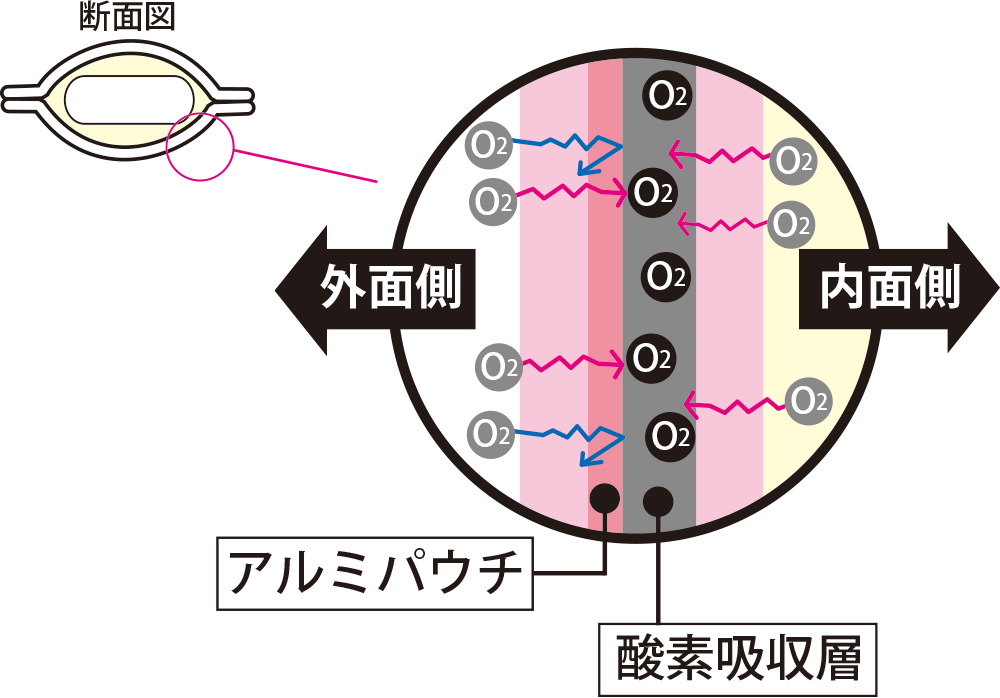 内面側から酸素吸収層に吸収されます。 - 外面側から浸透してくる酸素は